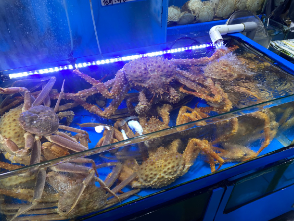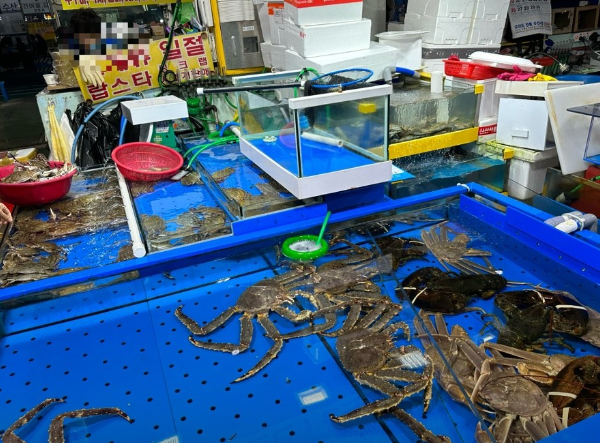 시장 내부 1층에는 광어, 참돔, 방어, 낙지, 꽃게, 쭈꾸미 등 제철 어종이 가득하며, 계절별로 신선한 수산물을 직접 고르고 구입할 수 있습니다. 특히 자연산·양식산·수입 대게까지 종류가 다양해, 방문객에게 선택의 폭을 넓혀줍니다.