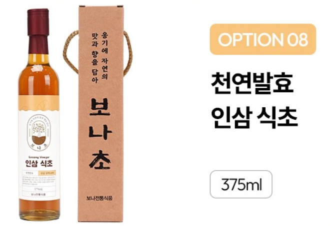 - 인삼 발효식초: 기력 회복과 면역력 증진을 원하는 분들께 적합.