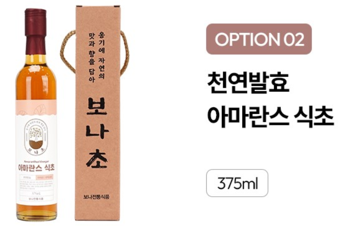 - 아마란스 발효식초: 단백질, 칼슘, 철분이 풍부한 슈퍼푸드 곡물에서 발효.
